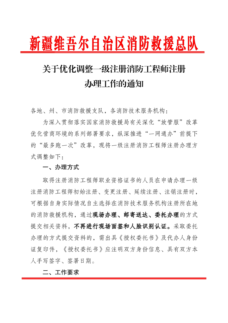 关于优化调整一级注册消防工程师注册办理工作的通知