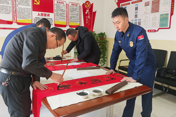 活动伊始,地区书法协会的老师们现场泼墨挥毫,国家一级编剧、中央电视台著名主持人赵保乐老师精心书写下“龙马精神”“万马奔腾”“马到成功”等极具象征意义的书法作品,为消防指战员送上饱含期许的墨宝。一众书法老师笔走龙蛇间,一幅幅寓意吉祥的春联与苍劲有力的“福”字跃然纸上。“红门砺剑护民安,艺苑传情迎新春”“烈火丹心守家国,墨香雅韵贺丰年”等春联,既饱含着对新春的美好期许,更彰显了对消防指战员的崇高敬意,让指战员们在笔墨香中提前感受到浓浓的年味。