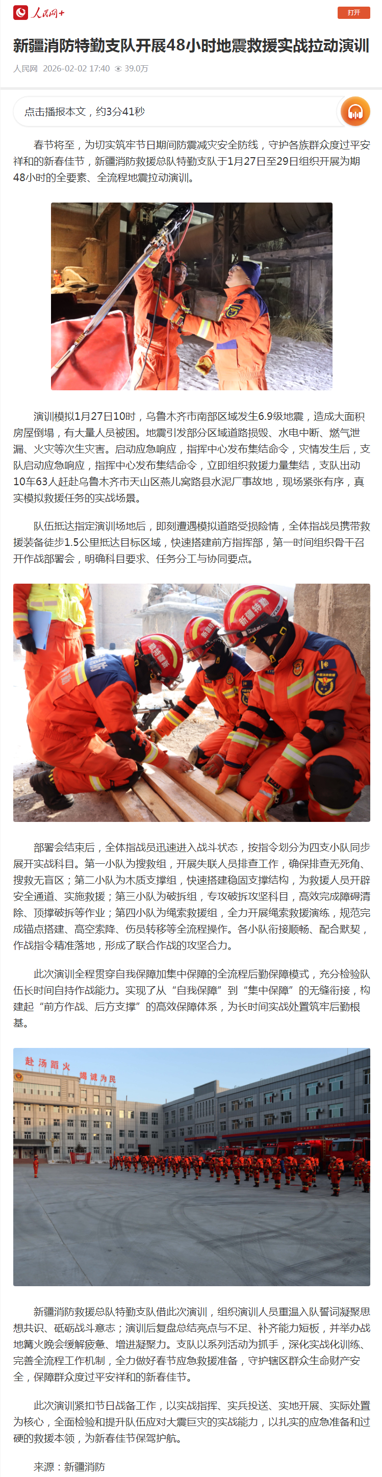 人民网:新疆消防特勤支队开展48小时地震救援实战拉动演训